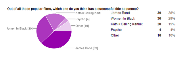 Our eighth question was "Out of all these popular films, which one do you think has a successful title sequence?". By finding this out we can then go on to look at why it worked so well and then influenced by it's success try to make our own that will have a similar effect. Toping the list was James Bond. We didn't find this surprising when we saw our results as we knew how iconic and loved the opening sequences of James Bond films are. Although we do appreciate it James Bond is so iconic and famous anything similar to it would be instantly though of as something from the James Bind series, for this reason it would be unpractical to use it in our title sequence.